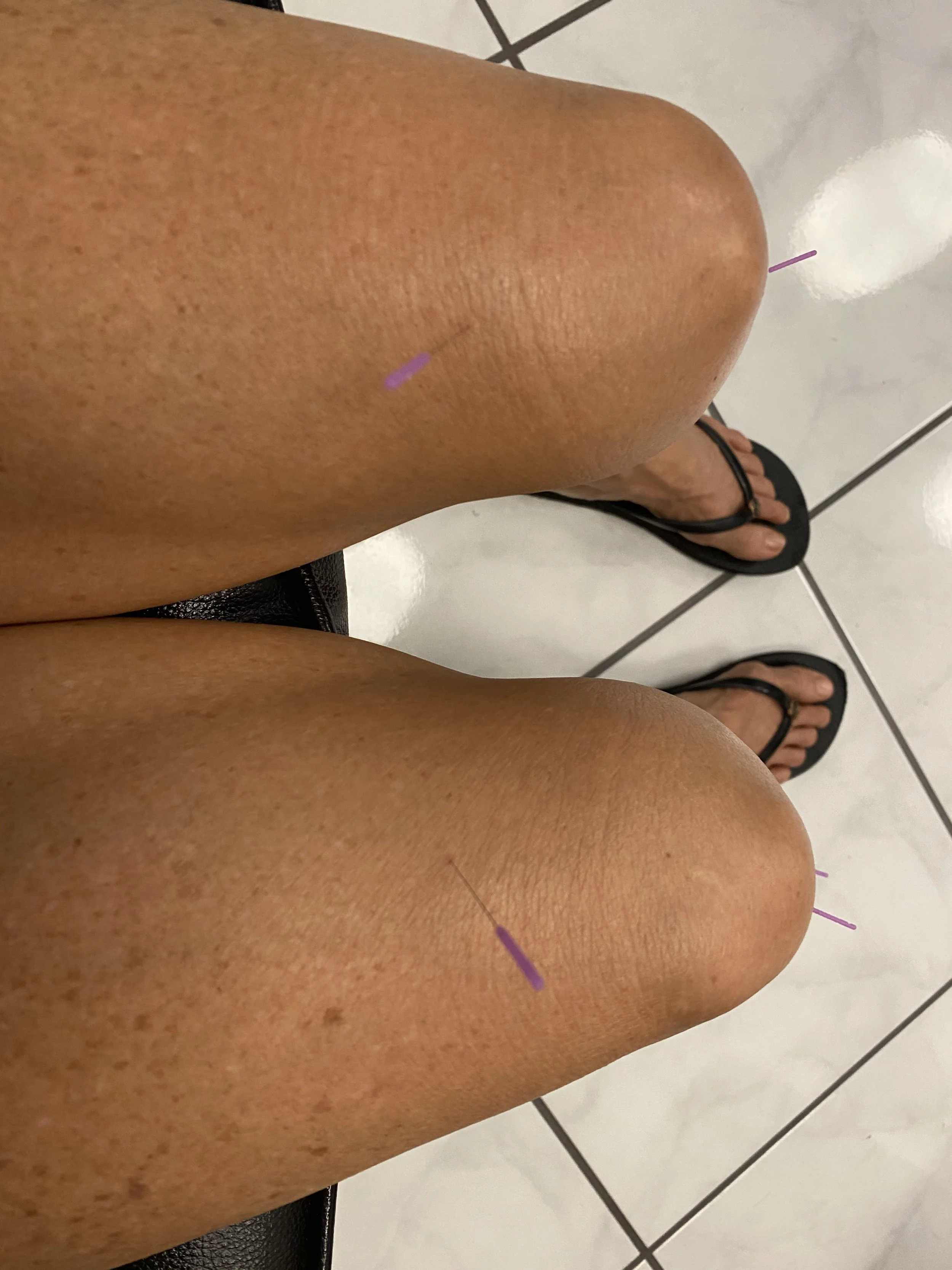 I had several rounds of acupuncture. He called his acupuncture "real Chinese acupuncture." He put a lot of needles in the top of my head, because this raises the Qi. The needles on the top of my knees would raise my Qi and blood, and the ones on the outside of my shins were for detoxification. The needle on my left shin kept popping out, and he said my liver was rejecting it. Hmmmm . . .