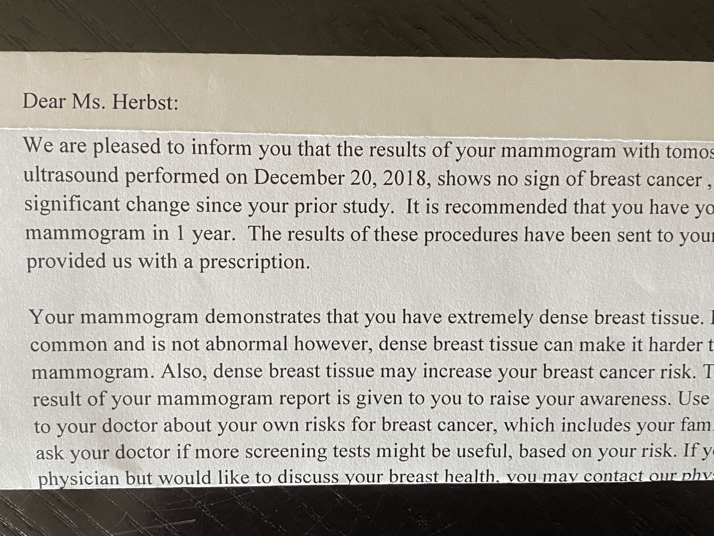 I had a routine mammogram, just ten months prior to my diagnosis, that was “normal.” The women’s center mailed me a letter congratulating me on my good results. I almost felt weak with relief. Joel had just finished chemo. All I wanted to do was to stay strong and healthy so that I could take care of my family and move past cancer, but little did I realize what the next year would hold.