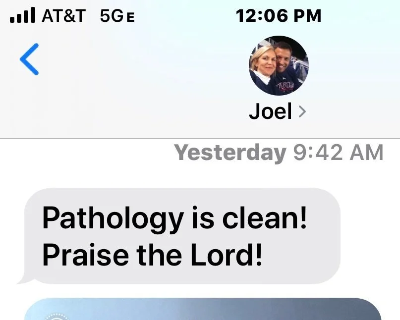 Shortly after Joel finished treatment, I had my annual mammogram. I felt higher anxiety than normal because of Joel’s diagnosis. My sister sent me this text: “It’s so difficult to learn, but it really is about relinquishing control. There are truly some things in this life that are out of our hands. Those are the times when we have to picture ourselves lying face down, prostrate before the Lord in complete surrender. When things are out of our hands, guess what? They are in HIS!”