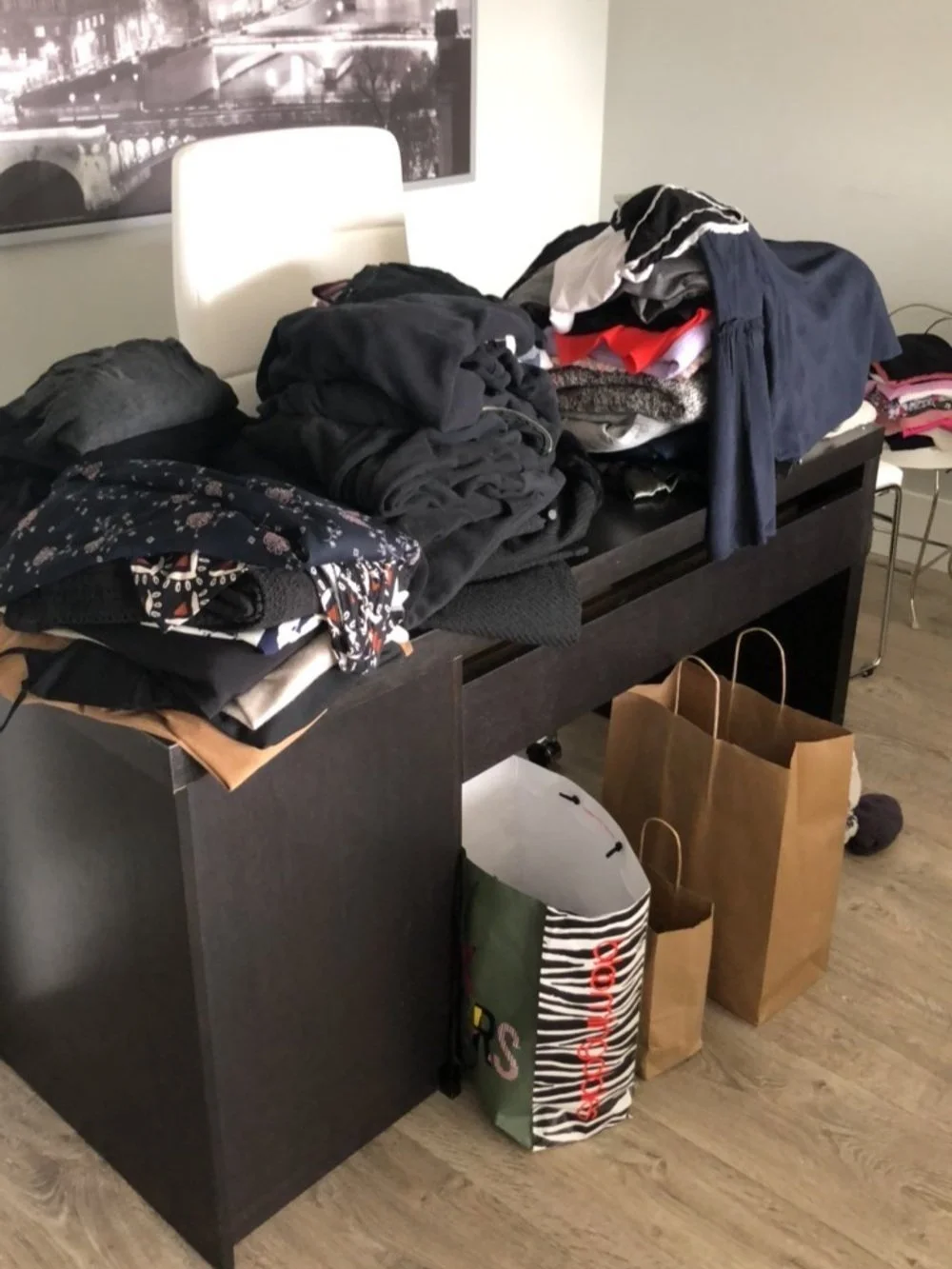 All of my beautiful clothes stacked up and ready to give away! I definitely went a little overboard, which I attribute to going through the stages of grief. :)